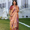 This is a traditional Brown Swarnachari Silk Saree, measuring 5.44 mtr with blouse pices, and pure Beige colour. Silk mark certified. The Brown Swarnachari Silk Saree is composed entirely of pure silk and features resham-made and golden zari figure designs across the body. Golden zari with an all-around designer figure border.
